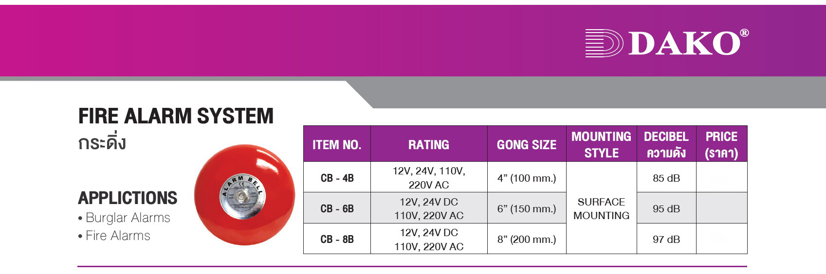 หมวดหมู่ | (DAKO) CB-4B, CB-6B, CB-8B กระดิ่งไฟฟ้า กริ่ง / Bell, Alarm Bell 4" 6" 8" |