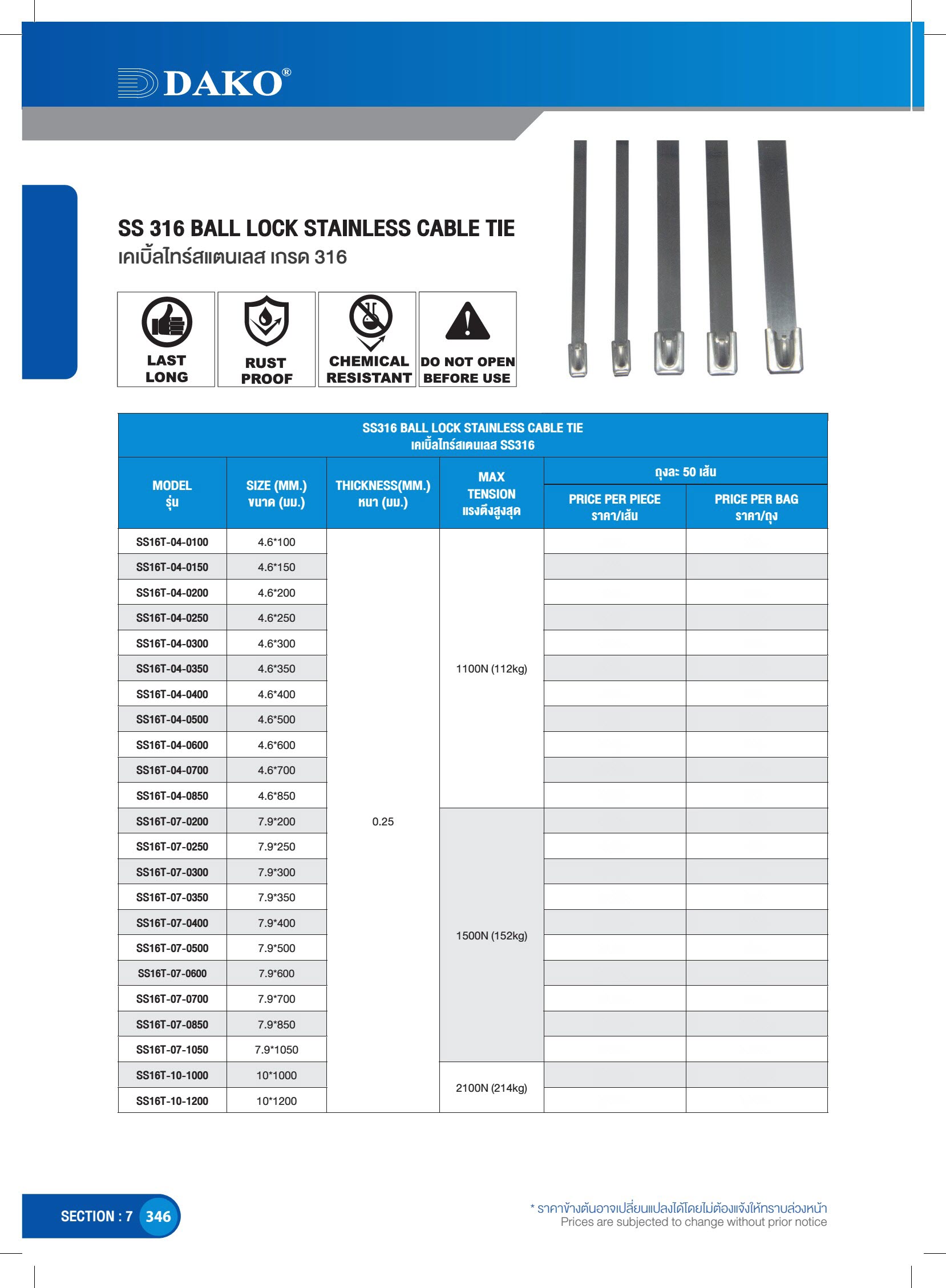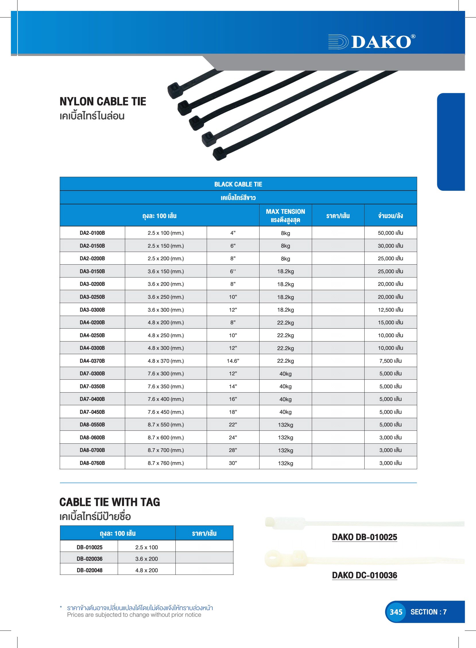 | หมวดหมู่ | เคเบิ้ลไทร์สีขาว-สีดำ มัดสายไฟดึงไม่ขาด / CABLE TIES, มาร์คเกอร์ไทร์ (สายรัดแบบมีป้าย) MARKER TIES, เคเบิ้ลแคล้ม CABLE CLAMP, เข็มขัด ใส่ปลอก MARKER STRIP (BANDEX) เคเบิ้ลไทร์ (ZT) |