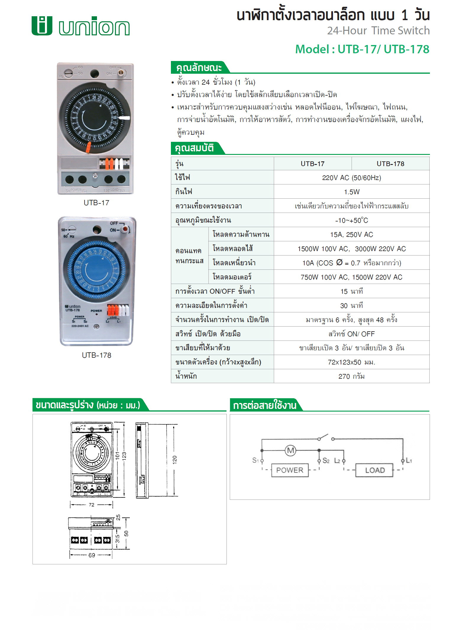 | หมวดหมู่ | (UNION) UTB-17, UTB-178 นาฬิกาตั้งเวลาอนาล็อก แบบ 1 วัน 24-Hour Time Switch |